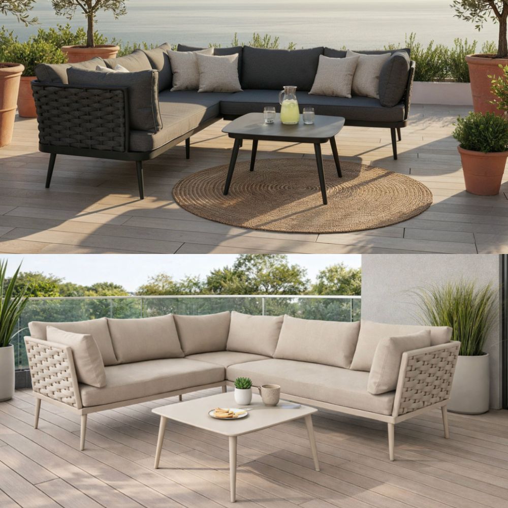 Zestawy gotowe to sprawdzone konfiguracje. Natomiast zestawy modułowe składasz z poszczególnych elementów (moduły wewnętrzne, narożniki, pufy, stoły), aby idealnie dopasować wymiary i funkcję do tarasu.