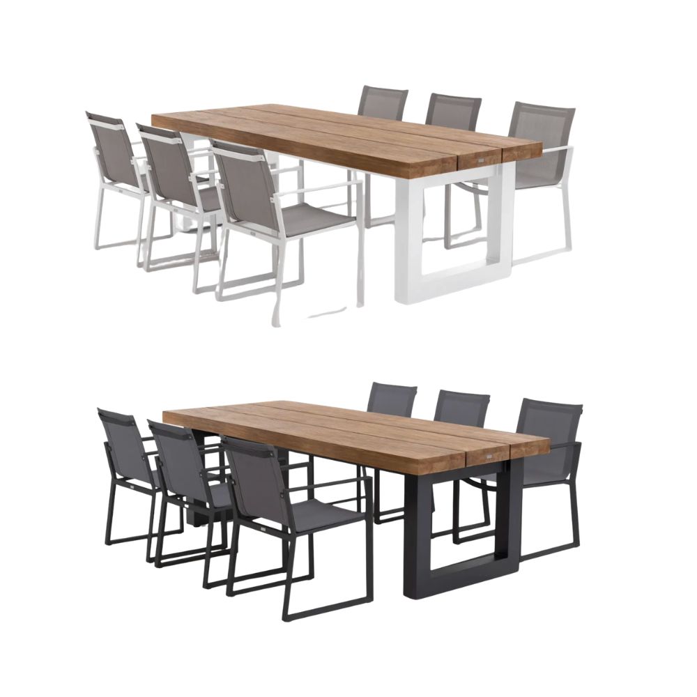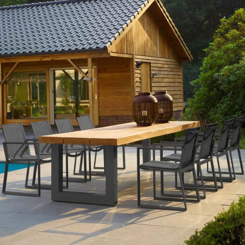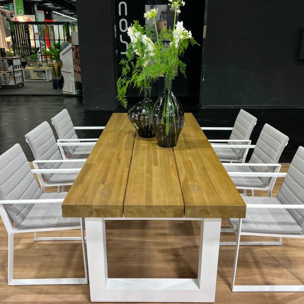 • Drewno tekowe – charakteryzuje się zdolnością do absorbowania ciepła, co sprawia, że mebel jest przyjemny w dotyku nawet w gorące dni. Jest także naturalnie bardzo odporne na gnicie i grzyby, co zapewnia długotrwałą trwałość mebla nawet w trudnych warunkach atmosferycznych. Dodatkowo, drewno posiada certyfikację, potwierdzając jego legalność i zrównoważone pochodzenie.
