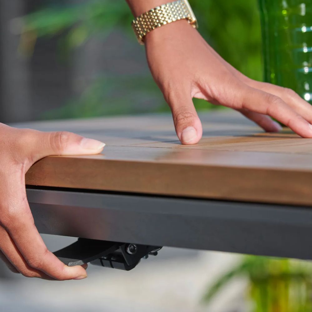 • Drewno tekowe – charakteryzuje się zdolnością do absorbowania ciepła, co sprawia, że mebel jest przyjemny w dotyku nawet w gorące dni. Jest także naturalnie bardzo odporne na gnicie i grzyby, co zapewnia długotrwałą trwałość mebla nawet w trudnych warunkach atmosferycznych. Dodatkowo, drewno posiada certyfikację, potwierdzając jego legalność i zrównoważone pochodzenie.